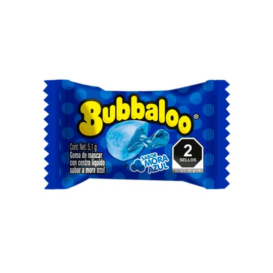 Adam's Bubbaloo Azul Mora is a chewy, blue berry-flavored gum with a chewy exterior and a blueberry liquid center, offering long-lasting sweetness. Net Weight: 5g Product Of Mexico